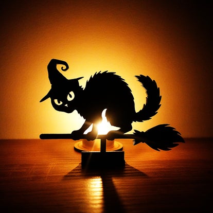 Deze zwarte kat op een bezem met heksenhoed brengt direct Halloween-magie in huis — perfect bij kaarslicht of als subtiel decorstuk.